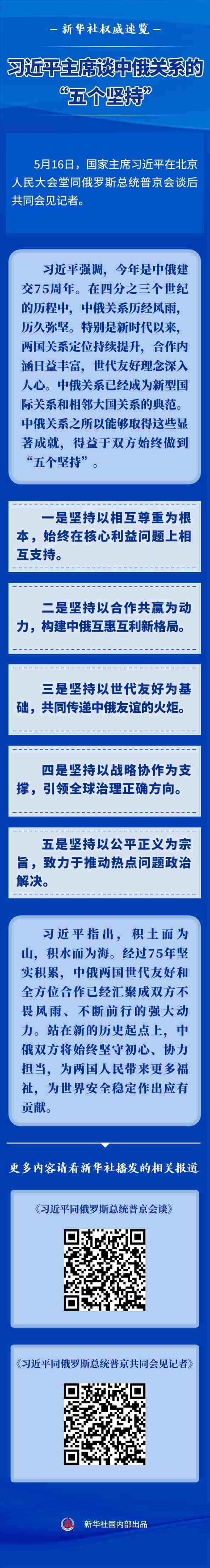 5月16日,國(guó)家主席習(xí)近平在北京人民大會(huì)堂同俄羅斯總統(tǒng)普京會(huì)談后共同會(huì)見(jiàn)記者。習(xí)主席談到中俄關(guān)系的“五個(gè)堅(jiān)持”。
