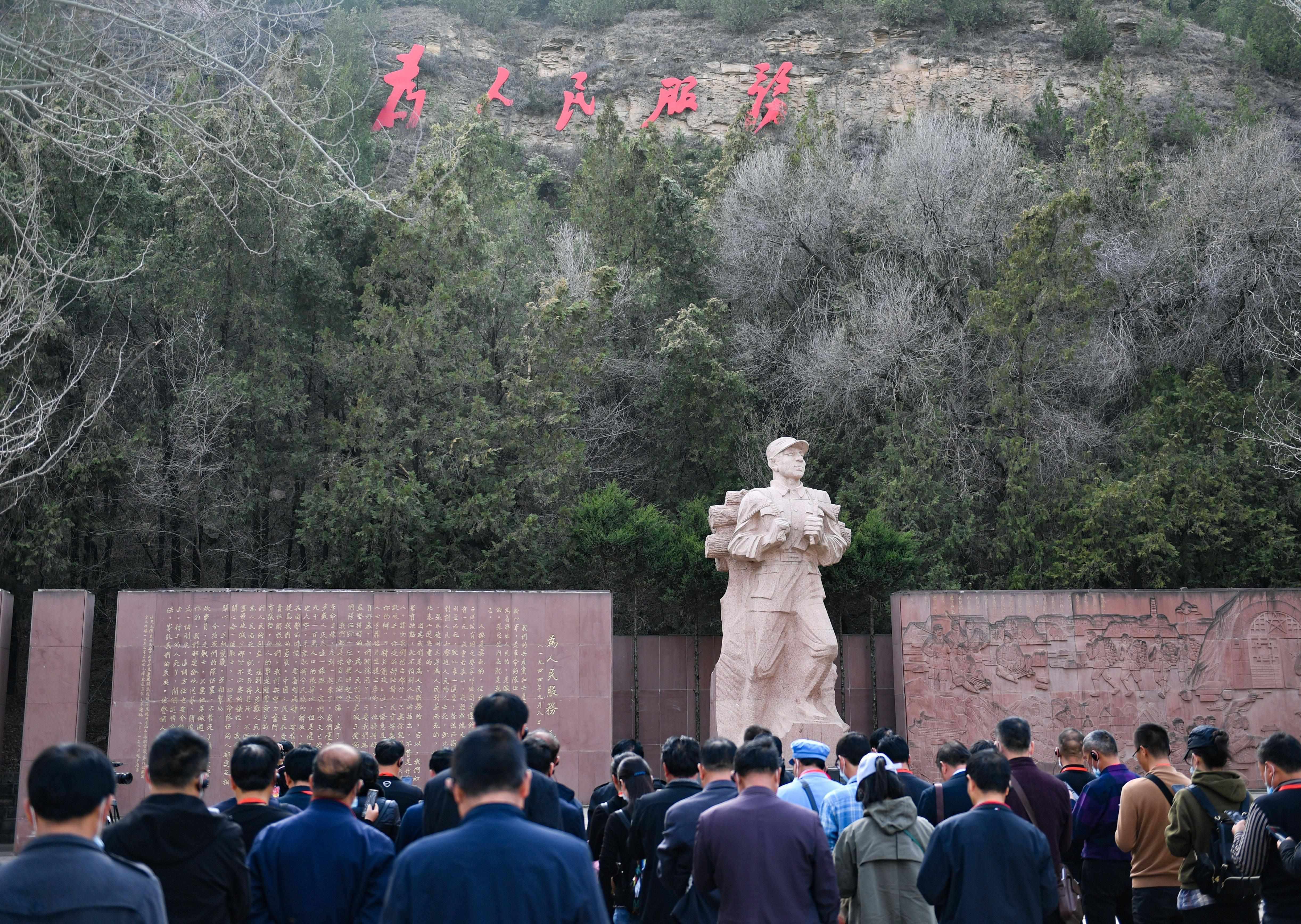 延安棗園,《為人民服務(wù)》講話(huà)紀(jì)念廣場(chǎng),張思德負(fù)薪前行的雕像,巍然屹立,“為人民服務(wù)”5個(gè)鮮紅大字,熠熠生輝?!熬哂腥娜鉃橹袊?guó)人民服務(wù)的精神”,在黨的七大上被寫(xiě)進(jìn)黨章。