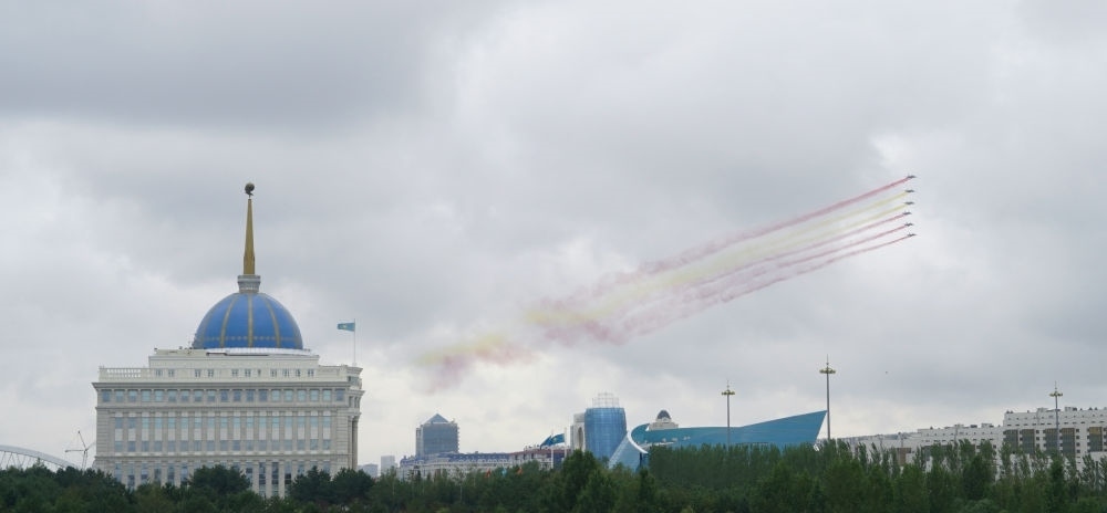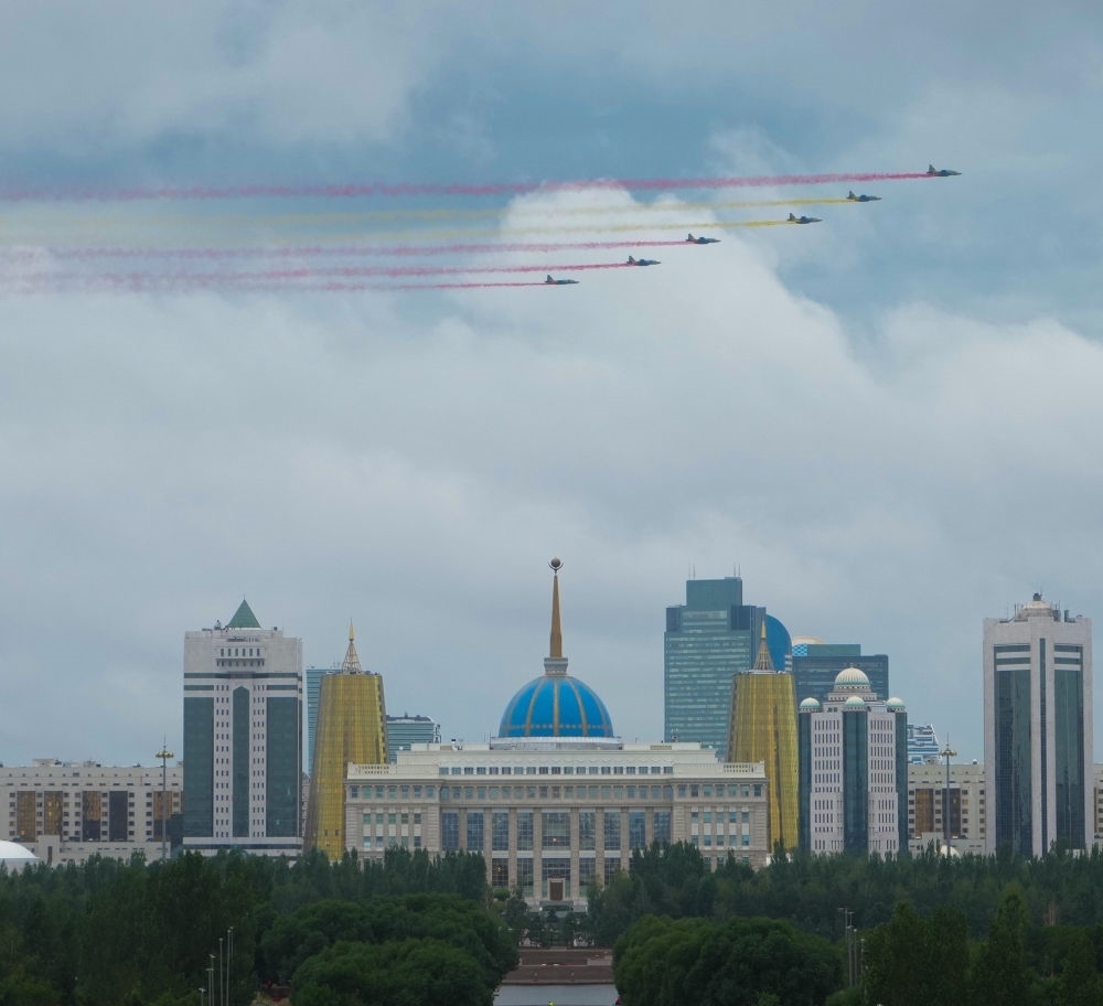 習(xí)近平主席抵達(dá)時(shí),哈方多架戰(zhàn)機(jī)在總統(tǒng)府上空拉出中國國旗色彩煙歡迎中國貴賓。