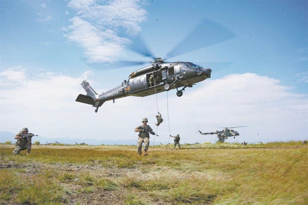 △第72集團(tuán)軍某旅某合成營官兵在陸航部隊(duì)配合下開展機(jī)降訓(xùn)練。