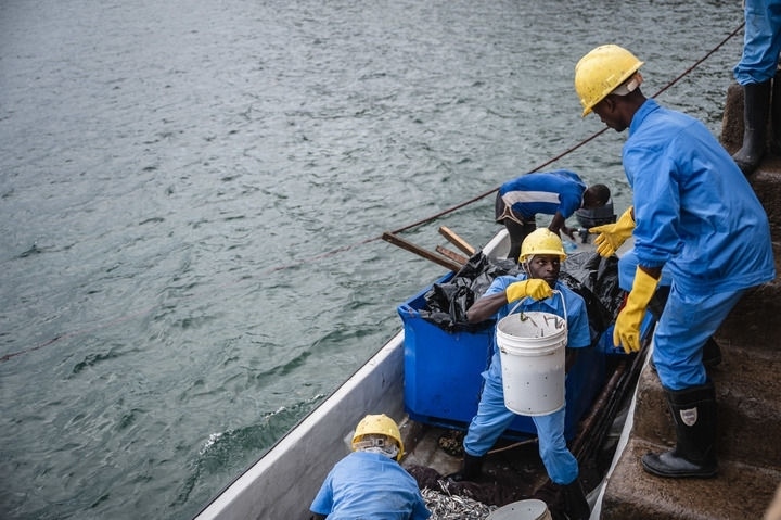 工作人員在肯尼亞夸萊郡希莫尼鎮(zhèn)一處港口搬運(yùn)新捕撈的鳀魚(2023年6月22日攝)。新華社記者 王冠森 攝