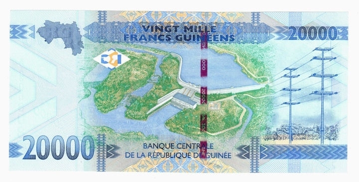 這是印有幾內(nèi)亞凱樂塔水電站效果圖的面值2萬幾內(nèi)亞法郎的紙幣。新華社發(fā)