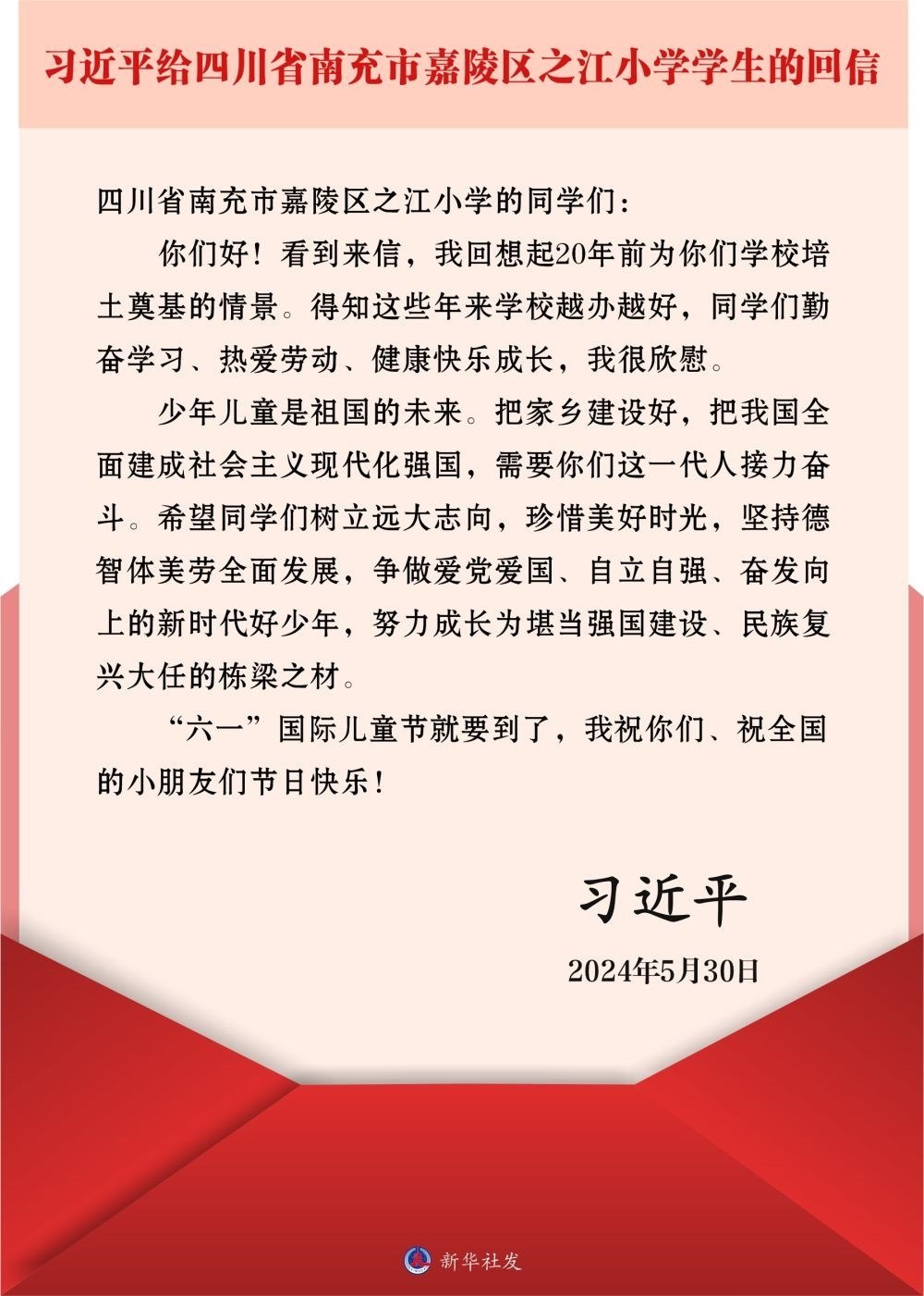 今年"六一"前夕,習(xí)近平總書記給之江小學(xué)的學(xué)生們回信:"得知這些年來學(xué)校越辦越好,同學(xué)們勤奮學(xué)習(xí)、熱愛勞動(dòng)、健康快樂成長,我很欣慰。"他勉勵(lì)同學(xué)們爭做愛黨愛國、自立自強(qiáng)、奮發(fā)向上的新時(shí)代好少年,努力成長為堪當(dāng)強(qiáng)國建設(shè)、民族復(fù)興大任的棟梁之材。