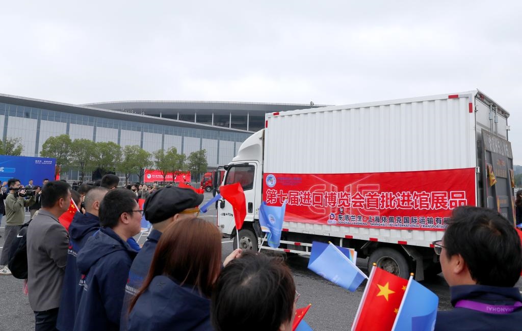 ??10月22日,裝載首批進(jìn)館展品的卡車駛?cè)雰x式現(xiàn)場。當(dāng)日,第七屆中國國際進(jìn)口博覽會(huì)首批展品進(jìn)館儀式在國家會(huì)展中心(上海)舉行。新華社記者方喆攝