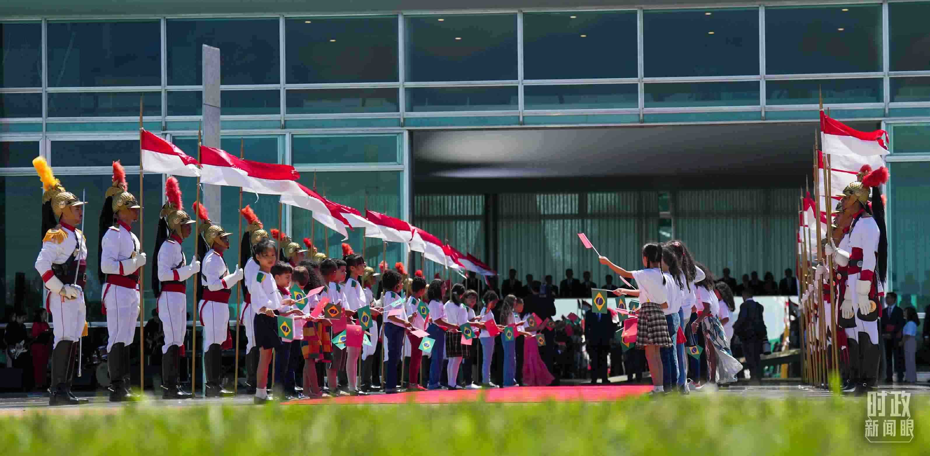儀式現(xiàn)場,中國和巴西兩國兒童揮舞國旗熱烈歡迎習主席。