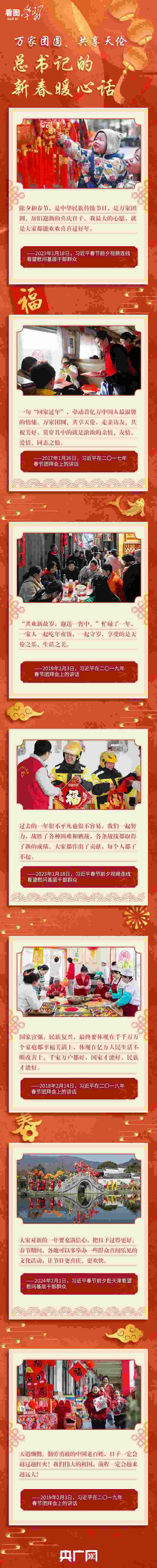 “共歡新故歲,迎送一宵中?!弊鳛橹腥A民族的傳統(tǒng)節(jié)日,除夕和春節(jié)是萬家團(tuán)圓、辭舊迎新最重要的日子。每年春節(jié)前夕,習(xí)近平總書記都要看望慰問各地基層干部群眾,向全國各族人民送上新春祝福。