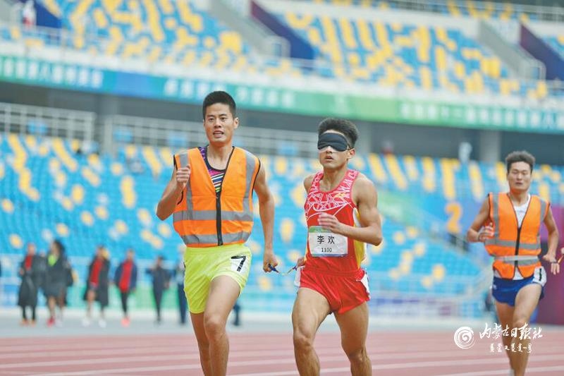 10月27日,內(nèi)蒙古盲人運(yùn)動(dòng)員李歡同他的領(lǐng)跑員楊?lèi)?ài)瑞獲得男子800米t11級(jí)銅牌。