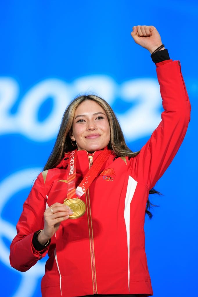 2月8日,冠軍中國(guó)選手谷愛凌在北京2022年冬奧會(huì)自由式滑雪女子大跳臺(tái)獎(jiǎng)牌頒發(fā)儀式上。新華社記者鞠煥宗攝