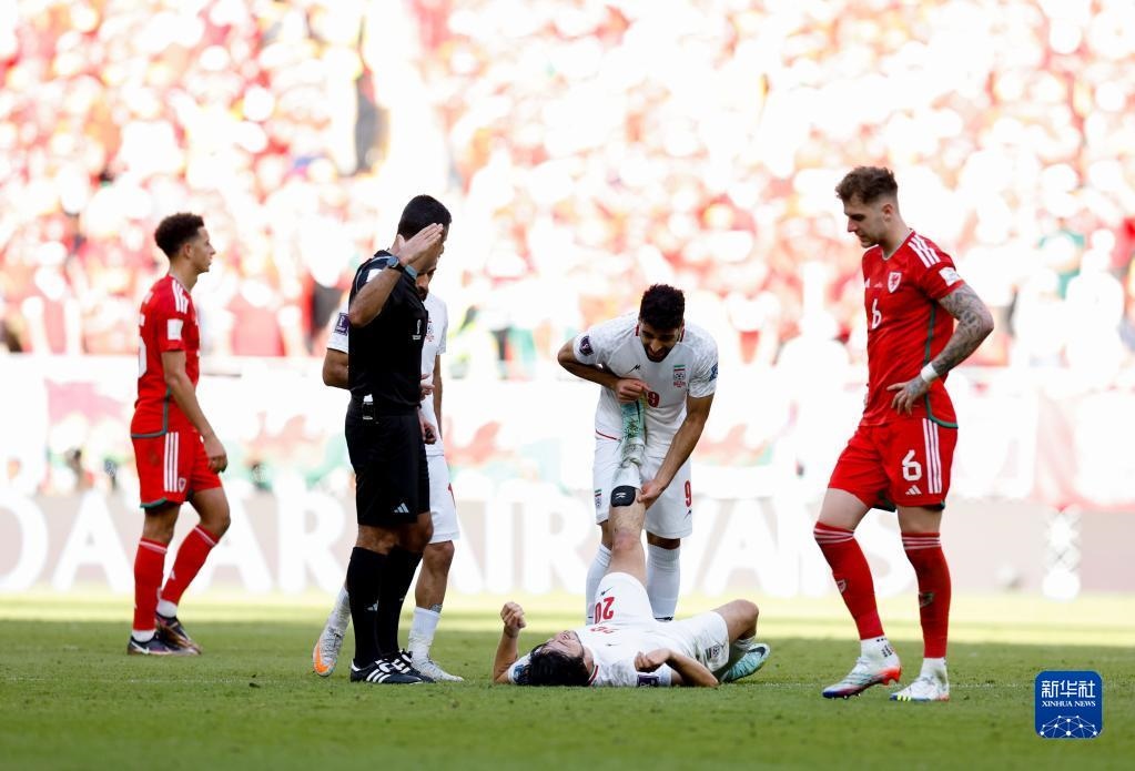 11月25日,伊朗隊球員阿茲蒙(下)在比賽中倒地。新華社記者 王麗莉 攝