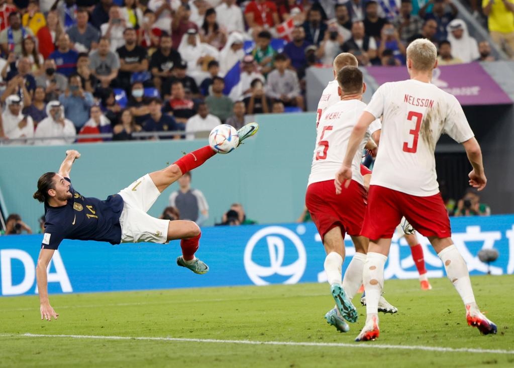 11月26日,法國隊球員拉比奧(左)在比賽中射門。新華社記者 王麗莉 攝