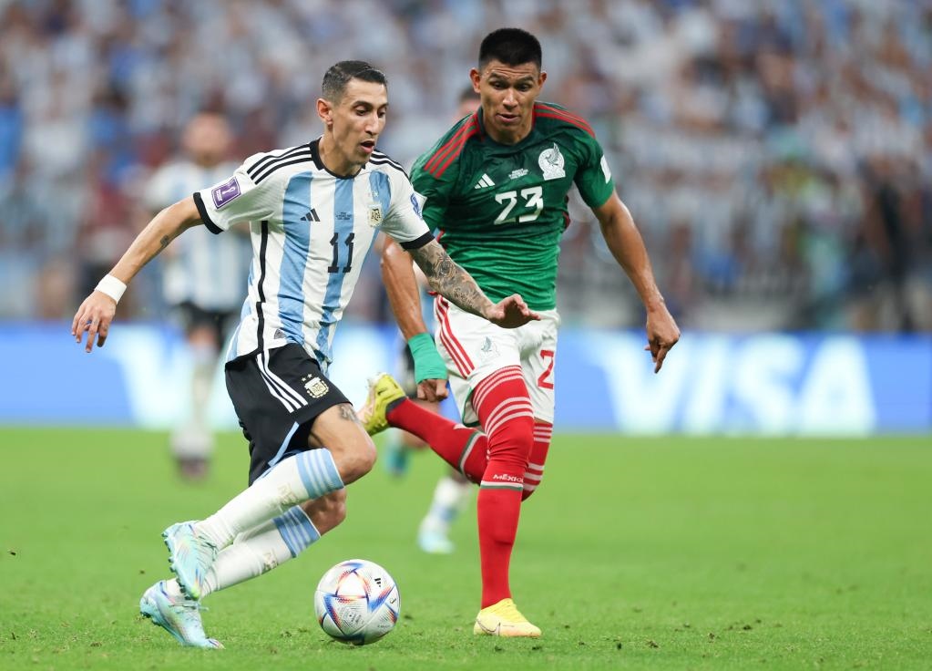 11月26日,阿根廷隊(duì)球員迪瑪利亞(左)在對陣墨西哥隊(duì)的比賽中突破。新華社記者 潘昱龍 攝