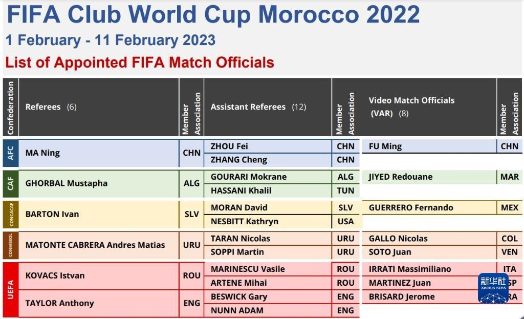 本屆世俱杯共選派來自5個洲際足聯的6個裁判組(3人團隊)和8名視頻助理裁判員執(zhí)法。選派的4名亞足聯裁判員均來自中國。