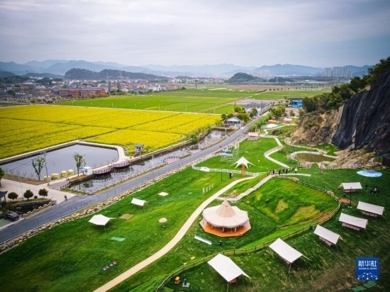 這是3月29日拍攝的諸暨市楓橋鎮(zhèn)杜黃新村用廢棄礦山改造的露營旅游地(無人機照片)。