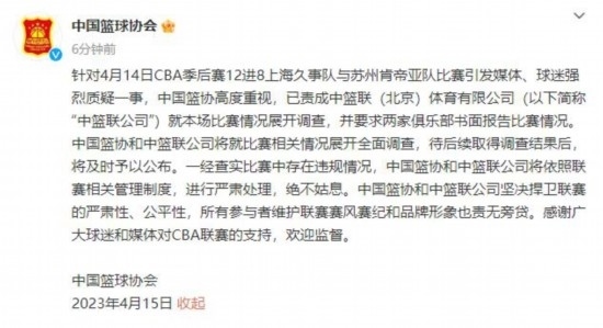 CBA聯(lián)賽官方微博15日凌晨發(fā)布消息表示:針對(duì)4月14日2022-2023賽季CBA聯(lián)賽季后賽12進(jìn)8、上海久事隊(duì)與蘇州肯帝亞隊(duì)比賽引發(fā)媒體、球迷強(qiáng)烈質(zhì)疑一事,中籃聯(lián)(北京)體育有限公司(以下簡稱“中籃聯(lián)公司”)高度重視,已就本場(chǎng)比賽情況展開調(diào)查,中國籃協(xié)也在第一時(shí)間責(zé)成中籃聯(lián)公司查明情況。中籃聯(lián)公司待后續(xù)取得調(diào)查結(jié)果后,將及時(shí)予以發(fā)布。