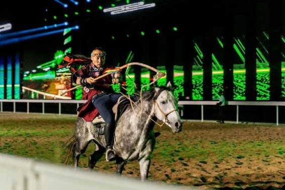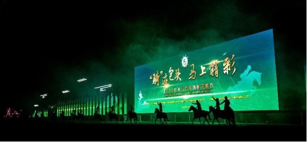 開幕式文體表演由《馬術(shù)方陣一馬當(dāng)先》、歌伴舞《我的城我的馬》、《名馬展示策馬揚鞭》、《單馬技巧雙翼神馬》、《馬障礙秀躍馬揚鞭》、《馬術(shù)秀人馬合一》、歌伴舞《騎跡包頭》、《無人機(jī)秀馬上精彩》八塊內(nèi)容組成。當(dāng)晚的賽汗塔拉馬術(shù)賽場流光溢彩、氣氛熱烈,場內(nèi)座無虛席、歡聲雷動。20時30分許,主騎手手持國旗,副騎手手持馬城旗幟,運動員方陣、民族方陣、女騎方陣、馬主方陣入場,騎手們精神飽滿、英姿颯爽,不時揮手致意,現(xiàn)場觀眾用熱烈的掌聲和歡呼聲,歡迎他們的到來。達(dá)茂旗9歲賽馬冠軍阿茹樂手持彩旗引出世界名馬亮相,40對人馬合一的“千古馬頌”表演震撼全場,1000架無人機(jī)躍然天空,點亮“騎跡包頭 馬上精彩”的字樣……藍(lán)天、碧水、凈土的包頭在策馬奔騰的馬術(shù)競技中拉開了“中國馬城”的壯麗畫卷。