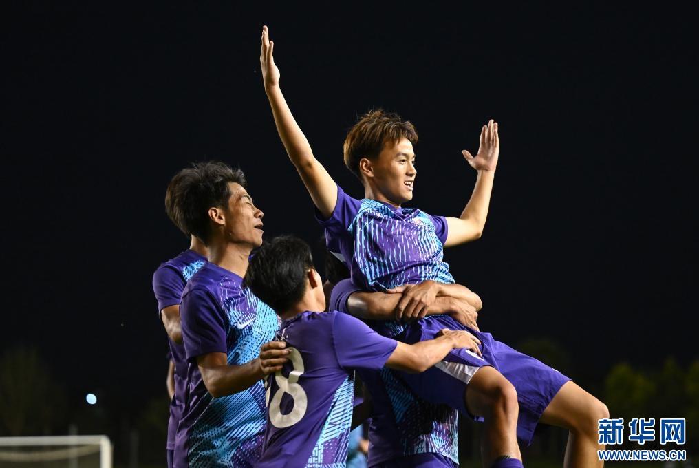 ??6月15日,天津津門(mén)虎U21隊(duì)球員王忠民(右一)在比賽中與隊(duì)友慶祝進(jìn)球。