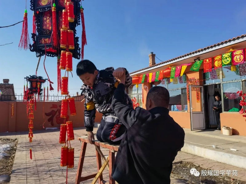 父親讓曈曈接地氣的愿望實現(xiàn)了,長得越來越壯實的曈曈真是打心眼喜歡上了農(nóng)村,喜歡看叔叔大爺們是如何勞動的。春天澆地的時候,他跟上我的發(fā)小利利到地里去,手里拿上一張鐵鍬學著去攏堰堤;秋收的時候他爬上了丁補元駕駛的收割機,感受農(nóng)民們收割玉米的喜悅;接羔的時候,他又鉆進利軍家的羊群里,抱著出生沒有幾天的小羊羔,給小羊羔喂牛奶……春節(jié)前的一兩天是他最忙的時候:一會跟上大爹貼春聯(lián),一會跟上茹義大爺掛紅燈,忙得不亦樂乎。前一段時間回村里他又要跟上利軍大爺出村放羊去,又要跟上茹義大爺去種玉米,在城里他是見識不到這些的。