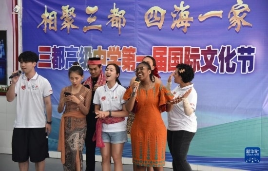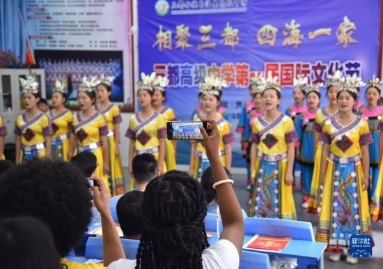 6月5日,來華留學(xué)生在三都高級(jí)中學(xué)第一屆國(guó)際文化節(jié)上演唱歌曲。