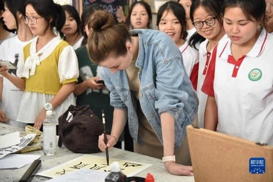 6月5日,參加三都高級(jí)中學(xué)第一屆國(guó)際文化節(jié)的來華留學(xué)生學(xué)習(xí)書寫水族文字。