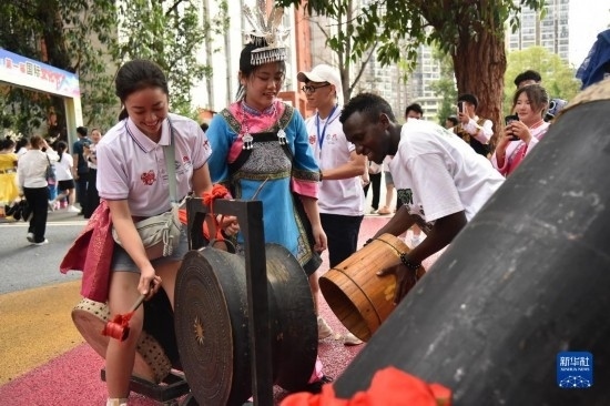 6月5日,參加三都高級(jí)中學(xué)第一屆國(guó)際文化節(jié)的來華留學(xué)生體驗(yàn)敲擊銅鼓。