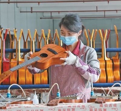 正安吉他文化產(chǎn)業(yè)園內(nèi),企業(yè)工人在制作樂(lè)器。趙永章攝