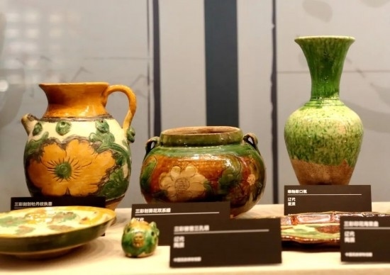 “遼三彩”直接承襲和模仿“唐三彩”,成為中華陶瓷文化傳承發(fā)展史上的重要一環(huán)。后排文物從左到右依次是:三彩刻劃牡丹紋執(zhí)壺、三彩劃葵花雙系罐、綠釉敞口瓶。(民族畫報記者 鷹鴿 攝)