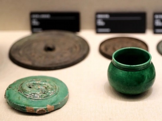 前排左:綠釉龍紋瓦當 金代 首都博物館藏;前排右:定窯綠釉矮領罐 金代 中國民族博物館藏。(民族畫報記者 鷹鴿 攝)