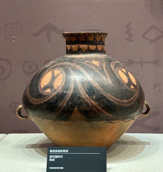 鋸齒旋渦紋陶壺 新石器時代 中國民族博物館藏。(民族畫報記者 鷹鴿 攝)