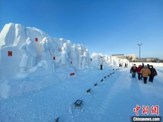 參會者觀賞神態(tài)逼真的武俠風(fēng)格雪雕作品。姜輝 攝