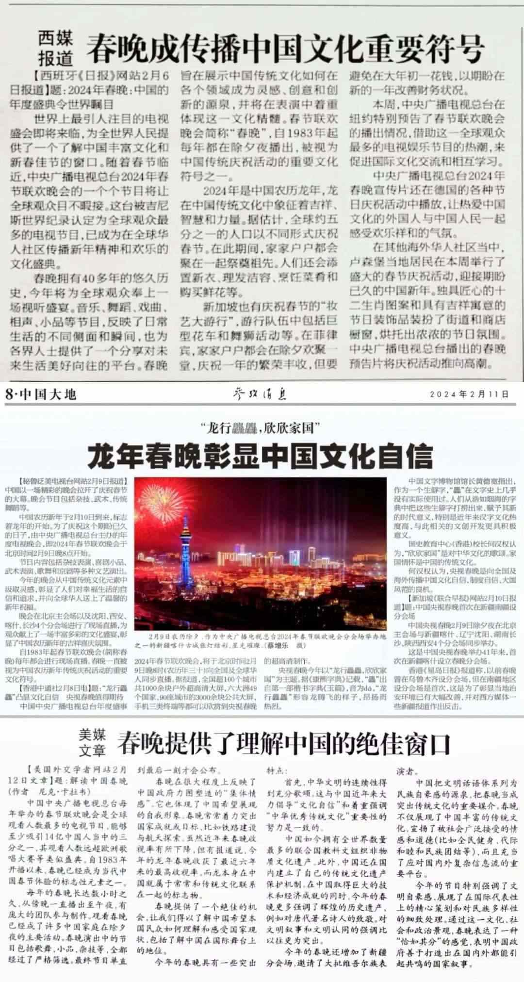 《參考消息》援引西班牙媒體評論稱,總臺龍年春晚為全世界人民提供了一個了解中國豐富文化的窗口,它展示中國傳統(tǒng)文化如何在各個領域成為靈感、創(chuàng)意和創(chuàng)新的源泉,并在音樂、舞蹈、戲曲等節(jié)目中體現(xiàn)傳統(tǒng)文化的精髓。秘魯、新加坡等媒體報道稱,龍年春晚彰顯了中國的文化自信。而美國《外交學者》網(wǎng)站署名文章認為,龍年春晚為世界提供了理解中國的絕佳窗口。海外媒體的這些報道,不約而同地使用了“文化符號”“標志性元素”等詞匯,并從促進文化理解、推動文化交流等角度對總臺春晚的海外影響力進行解讀。