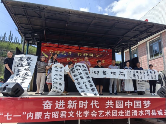 據(jù)了解,本次進社區(qū)活動由內(nèi)蒙古昭君文化學(xué)會、清水河縣城關(guān)鎮(zhèn)政府、昆新社區(qū)主辦,活動以“鑄牢中華民族共同體意識,構(gòu)筑中華民族共有精神家園”和慶祝中國共產(chǎn)黨建黨103周年為主旨,以書法、歌舞等群眾喜聞樂見的藝術(shù)形式,歌頌中國共產(chǎn)黨帶領(lǐng)全國各族人民守望相助、團結(jié)奮斗砥礪前行的光輝歷程以及取得的偉大成就,真情詮釋不忘初心,牢記使命的責任擔當。
