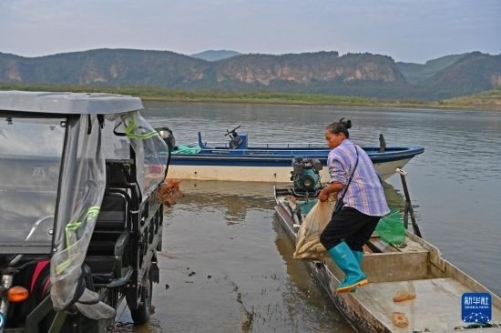 運(yùn)江古鎮(zhèn)的居民從船上搬運(yùn)魚貨(10月11日攝)。