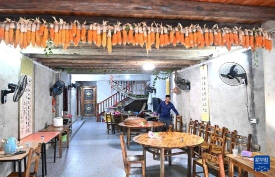 居民在運(yùn)江古鎮(zhèn)自家的民宿里整理桌椅(10月11日攝)。