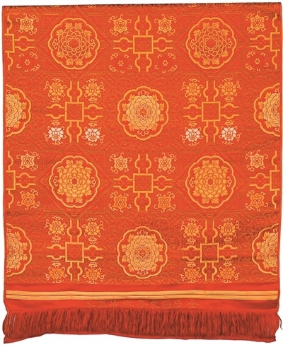 宋錦主產(chǎn)地為蘇州,與云錦、蜀錦并稱為中國古代三大名錦。宋錦采用經(jīng)線緯線聯(lián)合顯花的組織結(jié)構(gòu)和彩拋換色工藝,風(fēng)格古樸典雅,在古代多用于書畫裝裱,有著獨特的藝術(shù)魅力。清代紅地如意牡丹紋天華錦為宮廷用宋式錦,紅緞地上以彩色絲線和金線作緯顯花,圖案基本骨架為典型的宋錦紋樣——“米”字狀八達暈式樣,飾有牡丹、蓮花、如意紋等,寓意富貴安康、吉祥如意。
