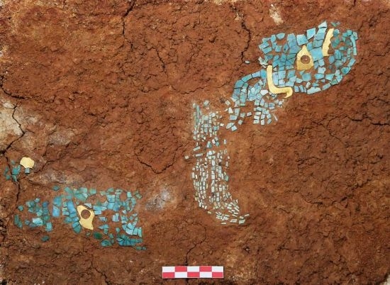 湖北黃陂盤(pán)龍城遺址楊家灣M17出土的金片綠松石鑲嵌飾。(全國(guó)十大考古新發(fā)現(xiàn)活動(dòng)辦公室供圖)