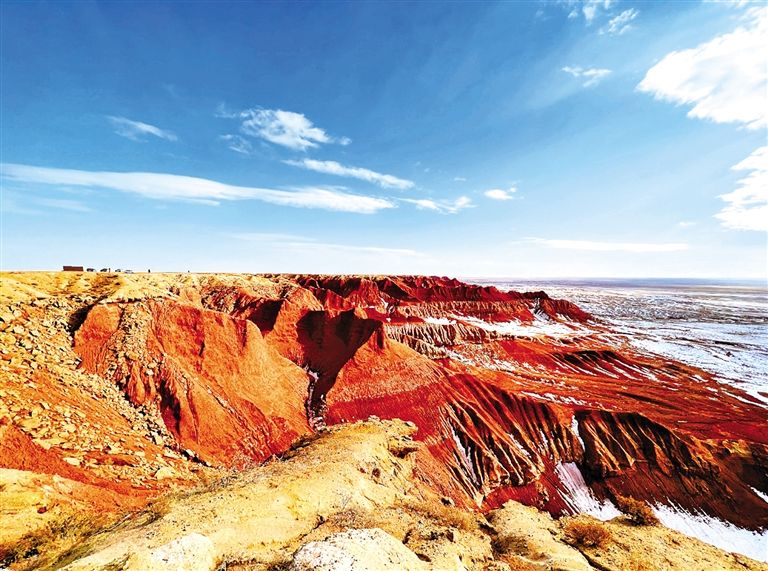 四子王旗大紅山,赤色丹霞地貌與雪原戈壁相映,繪就塞北獨(dú)有的蒼茫壯闊。王錦業(yè)  攝
