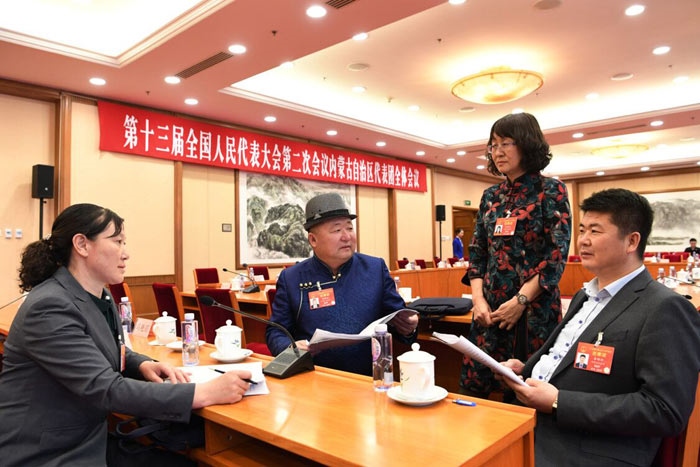 3月12日,內蒙古代表團的4名基層代表在全團會議結束后,仍在熱議“兩高”報告。 內蒙古日報社融媒體記者 袁永紅 攝