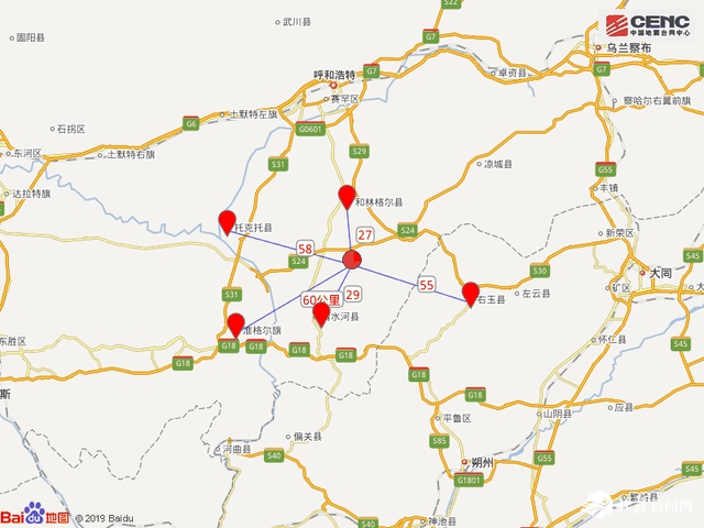 震中距和林格爾縣27公里、距清水河縣29公里、距山西右玉縣55公里、距托克托縣58公里、距準(zhǔn)格爾旗60公里,距呼和浩特市76公里。