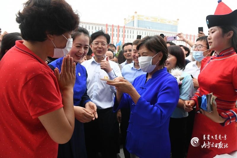 布小林認(rèn)真觀看精品旅游線路和重點景區(qū)、民族手工藝品、特色文創(chuàng)旅游商品、非物質(zhì)文化遺產(chǎn)、傳統(tǒng)技藝制作以及傳統(tǒng)蒙古包展示,了解文旅科技發(fā)展,并與相關(guān)人員交流商品的創(chuàng)意設(shè)計、制作工藝、市場銷售等情況,鼓勵他們保護(hù)傳承好民族手工藝、非物質(zhì)文化遺產(chǎn)和傳統(tǒng)技藝,注重將傳統(tǒng)工藝與現(xiàn)代技藝結(jié)合起來,與現(xiàn)實生活和時尚需求結(jié)合起來,使其具有更旺盛的生命力和更廣闊的市場。在內(nèi)蒙古味道展示區(qū),布小林仔細(xì)詢問特色美食的制作和食材來源,并向現(xiàn)場群眾介紹內(nèi)蒙古農(nóng)畜產(chǎn)品。她說:“內(nèi)蒙古的農(nóng)畜產(chǎn)品是有機(jī)、綠色的,大家可以放心吃?!?/p>