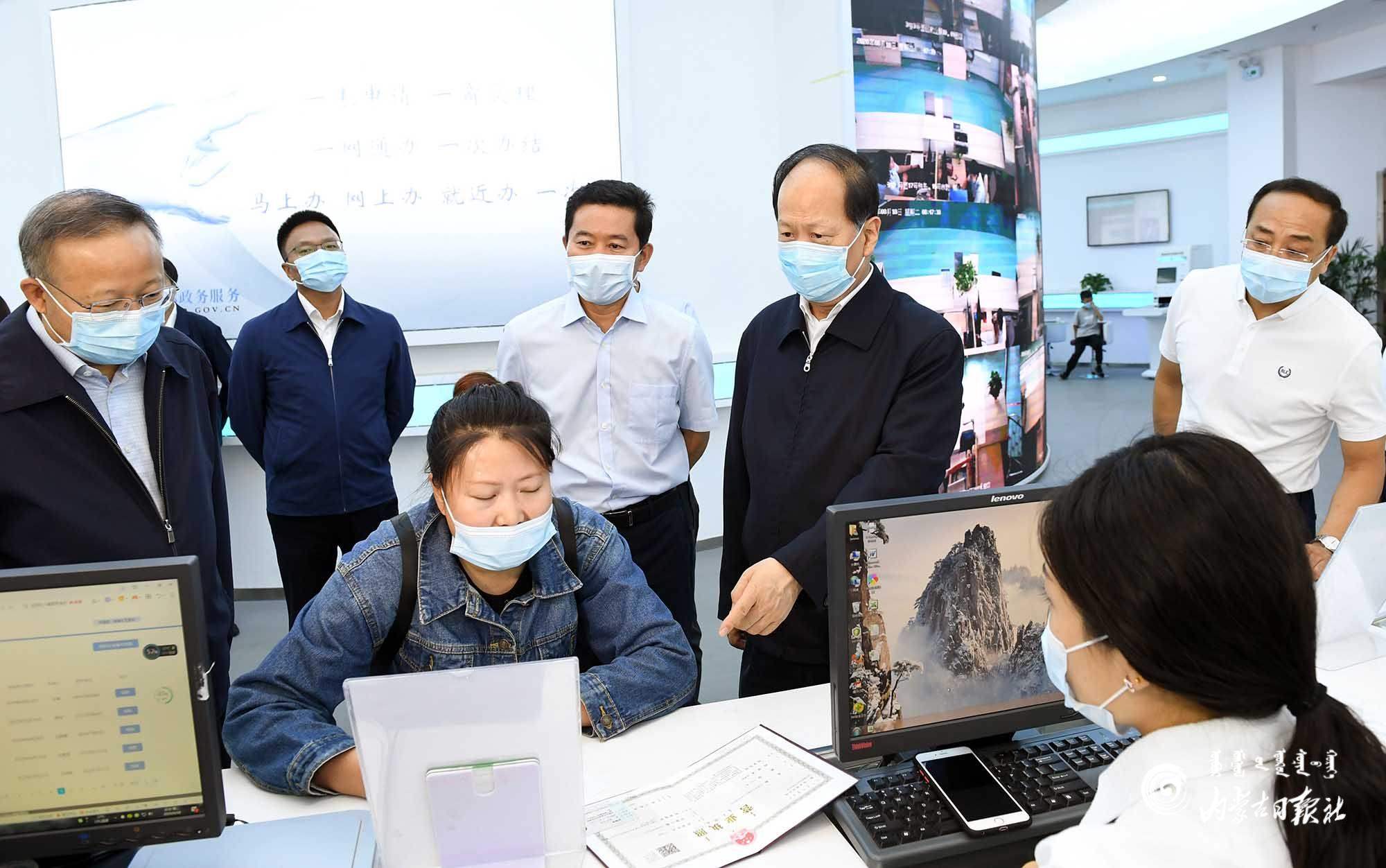 8月18日,自治區(qū)黨委書記、人大常委會主任石泰峰來到巴彥淖爾市臨河區(qū)市政服務(wù)中心,了解正在辦理企業(yè)注冊服務(wù)平臺流程。內(nèi)蒙古日報記者 袁永紅 攝