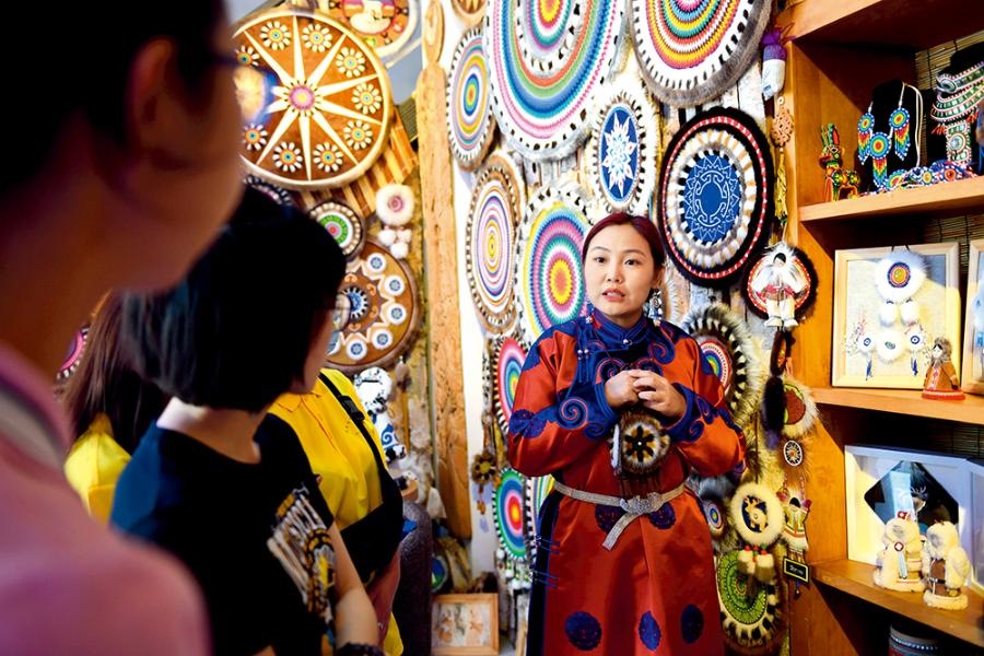 借助自己的鄂倫春族身份,白鵬英成立手工藝坊,組織婦女制作鄂倫春族手工藝品,然后利用網上平臺銷售到全國各地,每個婦女每年平均可增收1000元。