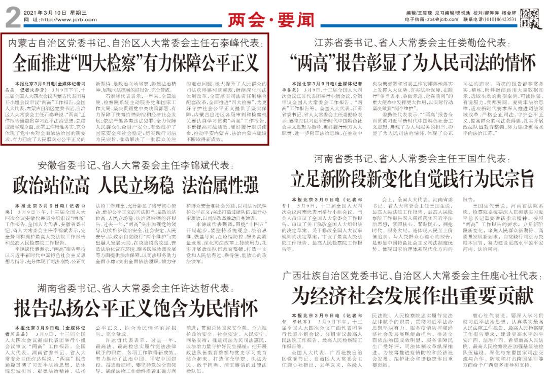 3月10日《檢察日?qǐng)?bào)》第2版——內(nèi)蒙古自治區(qū)黨委書(shū)記、自治區(qū)人大常委會(huì)主任石泰峰代表:全面推進(jìn)“四大檢察”有力保障公平正義
