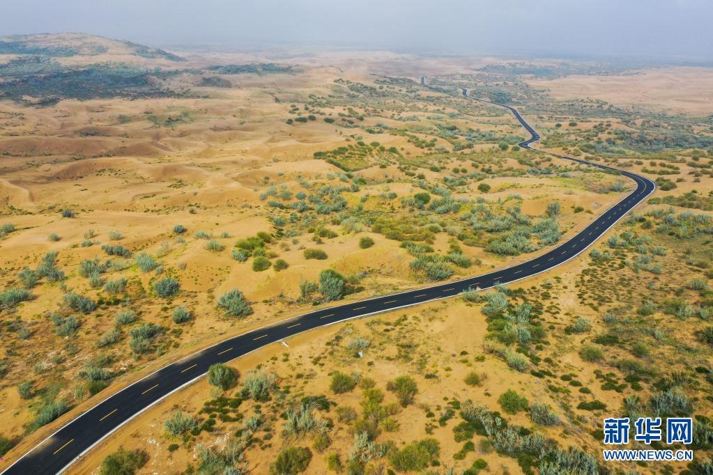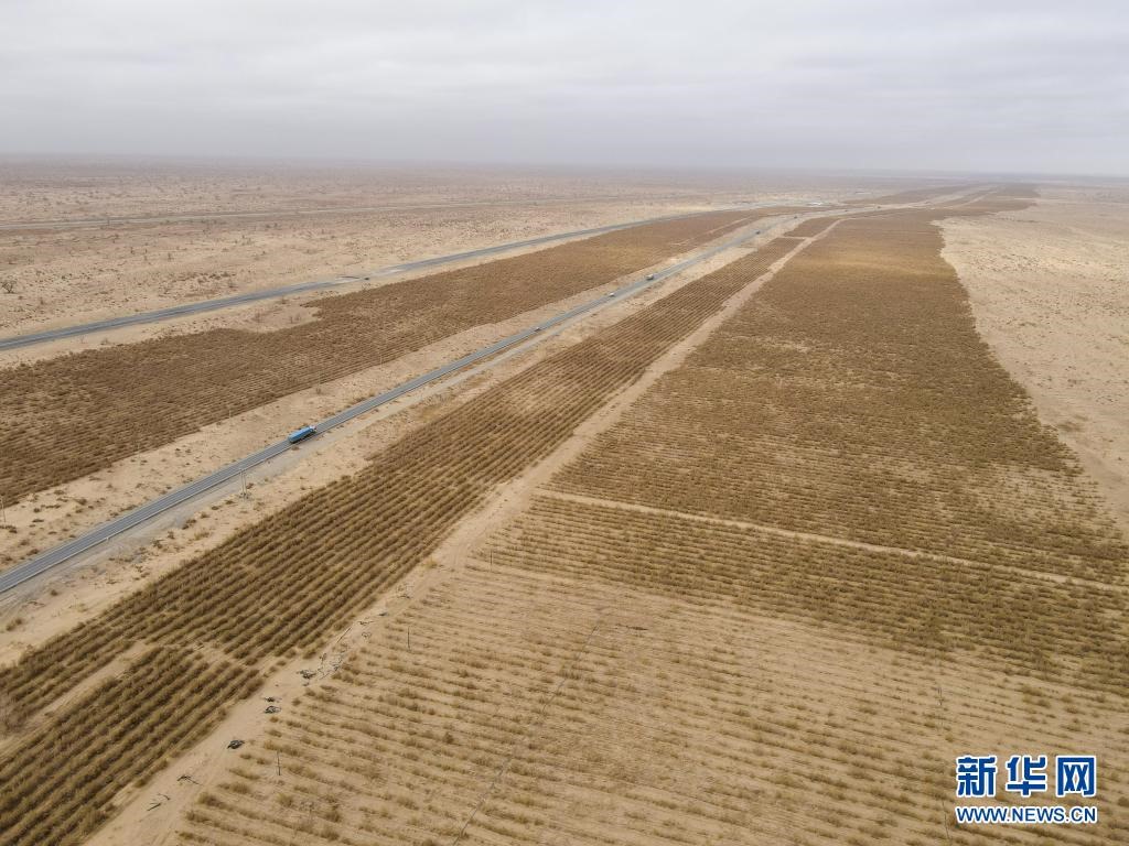 這是新疆且末縣國道旁種植的生態(tài)梭梭林(3月31日攝,無人機(jī)照片)。新華社記者 高晗 攝