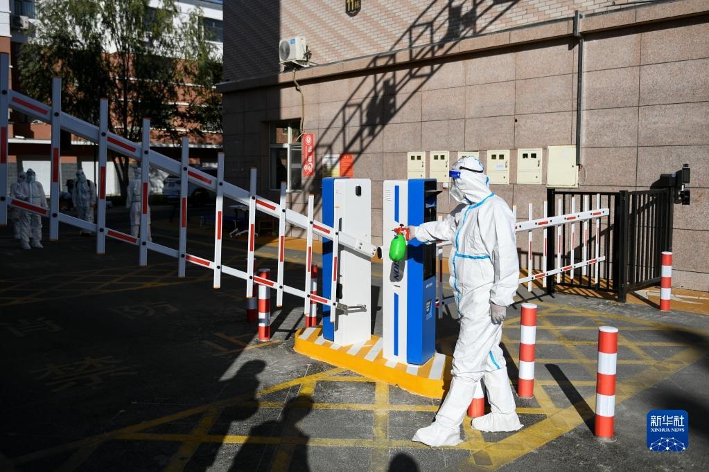 10月20日,在因疫情封控的阿拉善盟額濟納旗達來呼布鎮(zhèn)團結小區(qū)內(nèi),社區(qū)工作人員進行消殺工作。
