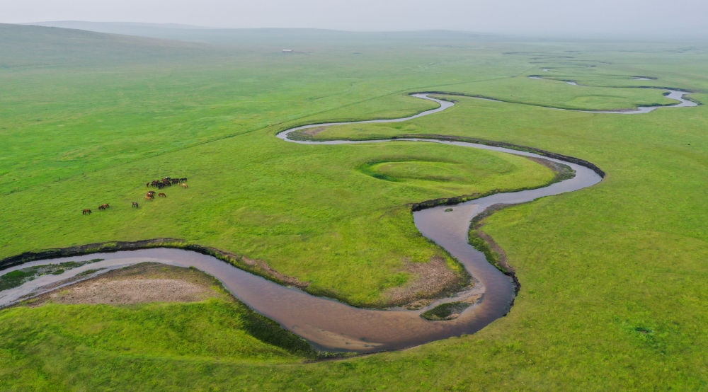 這是內(nèi)蒙古錫林郭勒盟東烏珠穆沁旗乃林高勒的草原風(fēng)光(2021年7月12日攝,無人機(jī)照片)。新華社記者連振攝