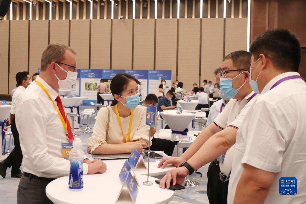 第五屆進(jìn)博會(huì)技術(shù)裝備展區(qū)展前供需對(duì)接會(huì)在上海舉行。這是參展商代表(前左二)在對(duì)接會(huì)上向采購商介紹企業(yè)產(chǎn)品情況(2022年8月8日攝)。新華社記者 方喆 攝