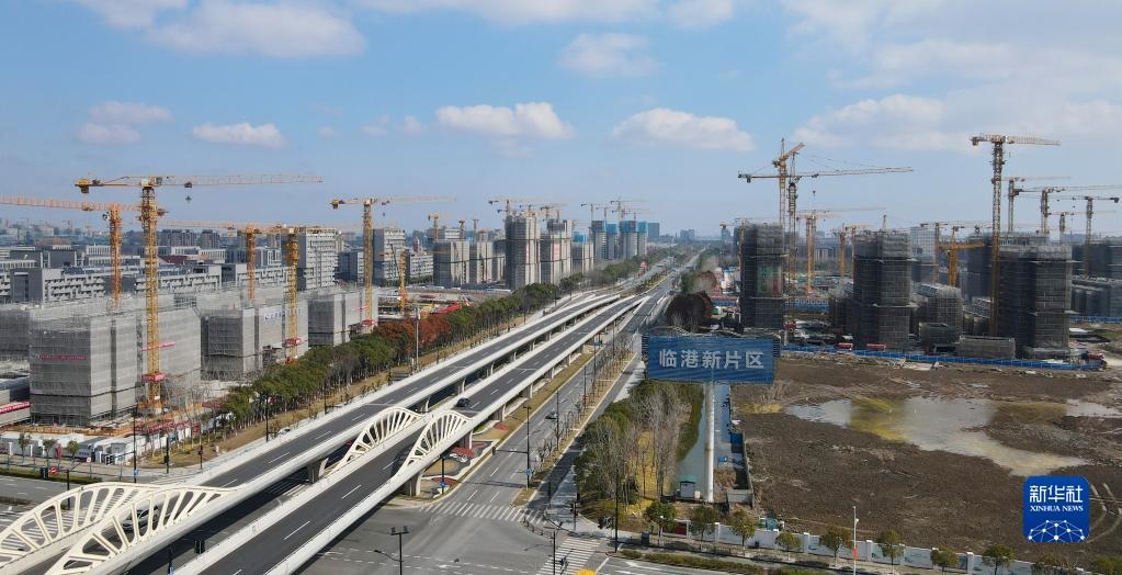中國(上海)自由貿(mào)易試驗(yàn)區(qū)臨港新片區(qū)申港大道兩側(cè)塔吊林立(2022年2月10日攝,無人機(jī)照片)。新華社記者 方喆 攝