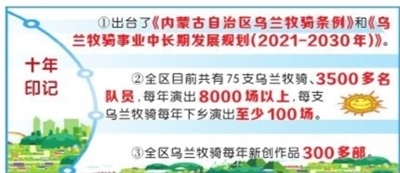 黨的十八大以來,烏蘭牧騎事業(yè)發(fā)展進入快車道。自治區(qū)制定了一系列加快推進烏蘭牧騎事業(yè)發(fā)展的政策,出臺了《內(nèi)蒙古自治區(qū)烏蘭牧騎條例》和《烏蘭牧騎事業(yè)中長期發(fā)展規(guī)劃(2021-2030年)》。設(shè)立全區(qū)烏蘭牧騎事業(yè)發(fā)展專項經(jīng)費,為75支烏蘭牧騎配備演出大巴車,新建烏蘭牧騎宮,舉辦烏蘭牧騎藝術(shù)節(jié)、全區(qū)烏蘭牧騎新人新作比賽,開展全區(qū)烏蘭牧騎交流演出、“烏蘭牧騎月”等活動,促進烏蘭牧騎互相學(xué)習(xí)發(fā)展。開發(fā)“網(wǎng)上烏蘭牧騎”PC版網(wǎng)頁和手機版微信H5,成立烏蘭牧騎輔導(dǎo)工作隊、志愿服務(wù)工作隊,為基層農(nóng)牧民提供藝術(shù)培訓(xùn)服務(wù)。以“烏蘭牧騎+”的方式深入基層,開展理論宣講、電影放映、法律咨詢等綜合志愿服務(wù)。加強烏蘭牧騎人才隊伍建設(shè),在錫林郭勒職業(yè)學(xué)院等設(shè)立烏蘭牧騎人才培訓(xùn)基地,舉辦全區(qū)烏蘭牧騎隊長培訓(xùn)班、舞臺藝術(shù)創(chuàng)作培訓(xùn)班等業(yè)務(wù)培訓(xùn)班。組織實施《烏蘭牧騎原創(chuàng)經(jīng)典作品名錄》工作和《全區(qū)烏蘭牧騎原創(chuàng)經(jīng)典作品傳承工程》。編輯出版《烏蘭牧騎回憶錄》《烏蘭牧騎優(yōu)秀作品選》。組織啟動烏蘭牧騎知識產(chǎn)權(quán)保護工作。