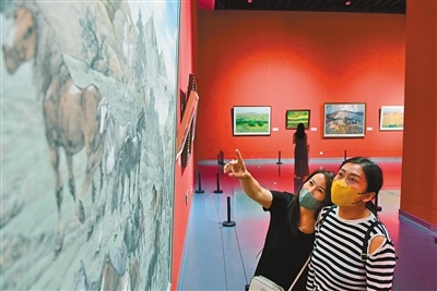 “美麗中國(guó)·內(nèi)蒙古形象”主題美術(shù)作品展聚焦“兩個(gè)打造”,119幅美術(shù)作品以全區(qū)12個(gè)盟市獨(dú)特的自然風(fēng)光、人文景觀、生態(tài)面貌為底色,描繪內(nèi)蒙古草之茂、林之郁、湖之美、水之秀、田之沃、沙之魅,全面展示了內(nèi)蒙古真善美的形象。記者 王磊 攝