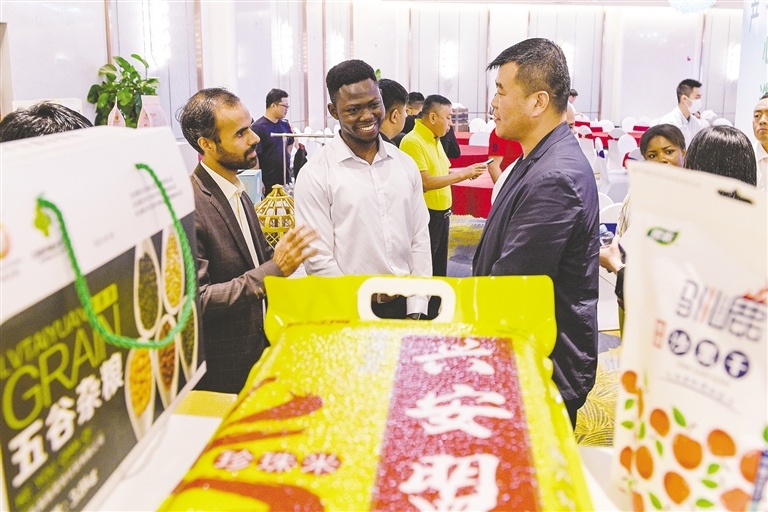 4月12日,第三屆中國國際消費品博覽會國外參展商詳細了解內(nèi)蒙古興安盟綠色有機農(nóng)畜產(chǎn)品。消博會期間,“內(nèi)蒙古·興安盟投資貿(mào)易”推介會在海南省海口市舉行。推介會現(xiàn)場促成參會企業(yè)簽約項目9個,預計合作投資額近12億元。作為國家重要的農(nóng)畜產(chǎn)品生產(chǎn)基地,來自內(nèi)蒙古的優(yōu)勢特色農(nóng)畜產(chǎn)品正走出中國賣向全球。(內(nèi)蒙古日報社融媒體記者 王曉博 攝)